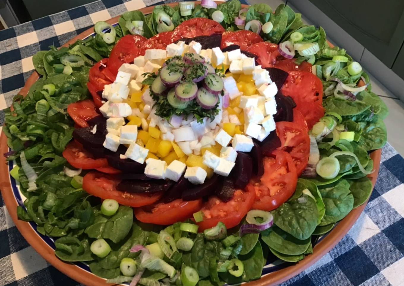 Salade de jeunes pousses d épinards, betteraves rouges,poivron jaune,feta et oignon rouge botte